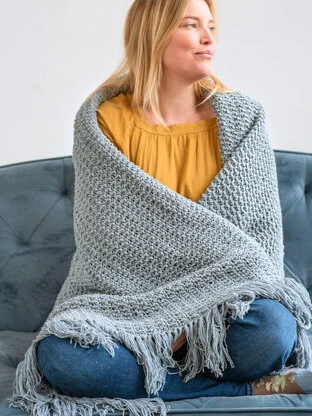 fringe in Remix light. This comfy piece is knit flat from end to end; it’s perfect for beginners. A thick