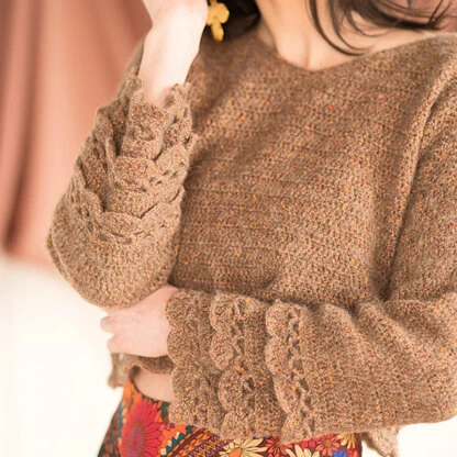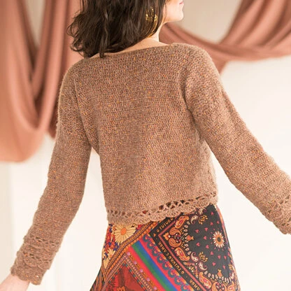 Berroco Kellar combines a vintage feel with a modern cropped silhouette for a crochet pullover that has a romantic style that’s versatile enough for everyday wear. Kellar is crocheted in the round from the lace hem to the underarms, where the back and front are completed separately and seamed at the shoulders. Drop-shoulder sleeves are worked in the round to the wrist with layers of lace ruffles giving a distinct feminine style. Mistico yarn ensures that your finished sweater will be soft, warm, and lightweight with its unique blend of brushed alpaca halo and cotton, wool, and nylon core. Easy to wear on its own with skirts or jeans, Kellar is also a versatile layer that will top flowy dresses or tunics for extra style and warmth. Crochet lace pattern is both charted and written out.