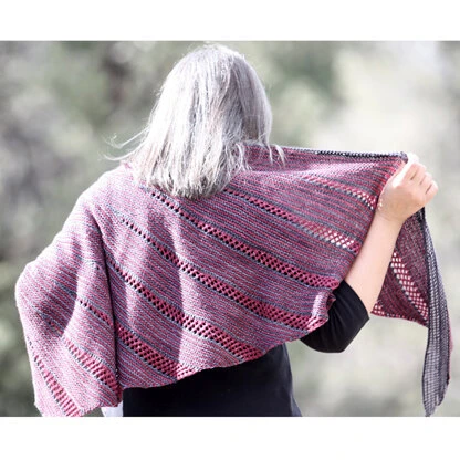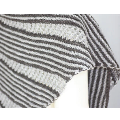 Designs By Romi Swoop, a striped shawl forms a wing shape by inserting one wedge of lace pattern upon another. This design comes in two sizes either using fingering weight or DK weight yarn. The shawl is bound off with an i-cord edging in reverse stockinette stitch while integrating perfectly to the garter stitch of the shawl.