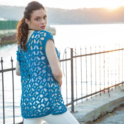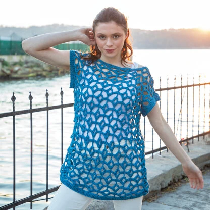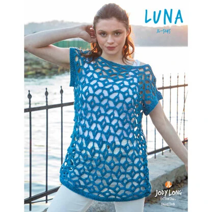Jody Long Luna is a stunning women’s pullover crocheted in Cottontails. The sweater showcases a boat neckline, dropped shoulders, and circles and arches creating a mesmerizing piece perfect to wear over a camisole or as a coverup over your swimsuit. Luna is crocheted in pieces from the bottom up and then seamed. The armhole borders are worked in the round. Cottontails from Jody Long is a bright summer yarn! This yarn is 100% cotton and has a chainette construction making it great for this sweater. The lace pattern is in written form only.