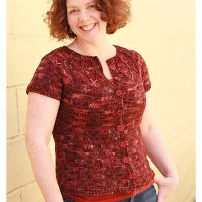 Like piped frosting on a birthday cake, apply post stitches to the yoke of Linda Permann’s Piped Petals Cardigan for a fanciful decoration. Worked from the top down in one piece with no seams, it’s easy to adjust the fit as you go. Make it short sleeved as shown, or work long sleeves for a version that will take you through winter.