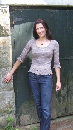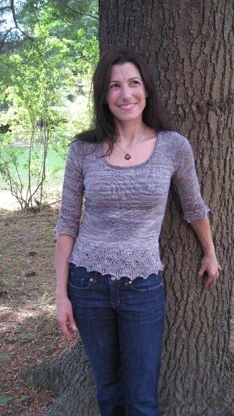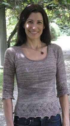 Elphaba from Lyrical Knits is a top-down, seamless pullover with raglan sleeves, a scoop neckline, and a beautiful lace pattern at the hem and cuffs. This pullover is also available in children’s sizes in the design called Elphabette. The lace pattern is charted and written out.
