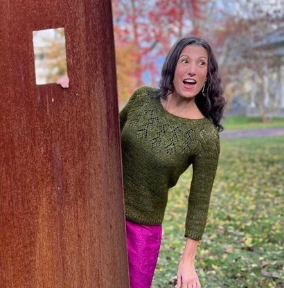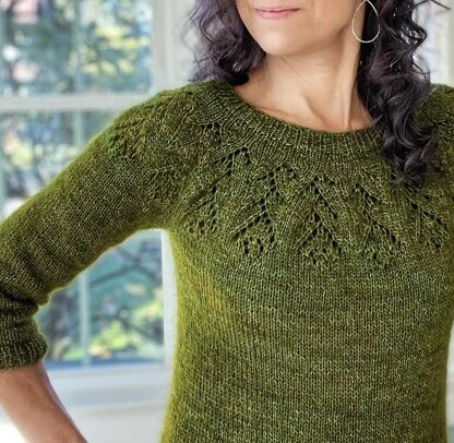 pattern yoke and three-quarter sleeves knit from the top down seamlessly. The