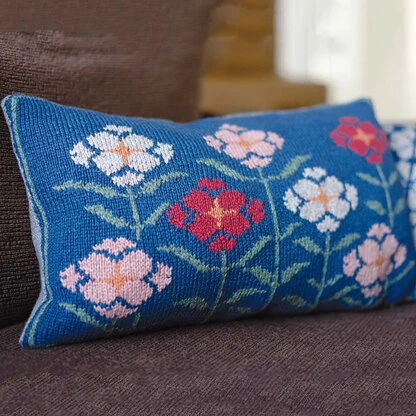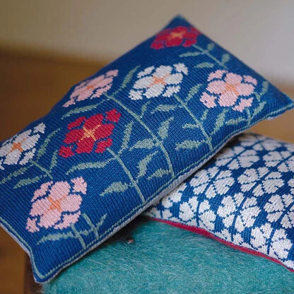 Rowan Agda by Arne & Carlos is designed on a foundation of Norwegian folk art and a playful love of color knit in Softyak DK. This cushion has the option of a large floral motif and a geometric pattern which can be used with a plain pillow back or paired for a spectacular effect. Rowan Softyak DK is a blend of yak, cotton, and nylon that has the best of all worlds: the softness of cashmere combined with durability and washability. The intarsia patterns are in chart form only.