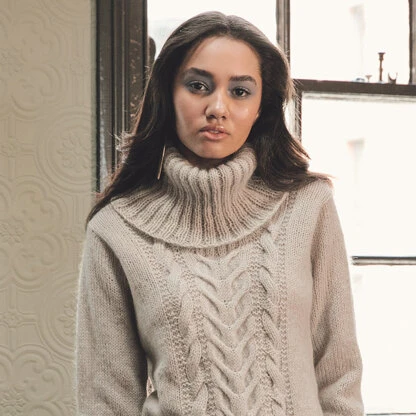 Rowan Ansonia designed by Amy Herzog features a cozy ribbed roll neck and an elegant cable pattern, this is the perfect addition to any winter wardrobe. Ansonia can also be knitted as a vest. The pullover with sleeves is knit in Rowan Kid Classic, a mohair blend with a delightful fuzziness, soft hand, and just enough polyamide for durability. The vest is knit in Rowan Hemp Tweed a fantastic blend of wool and hemp that creates a breathable knitted fabric.