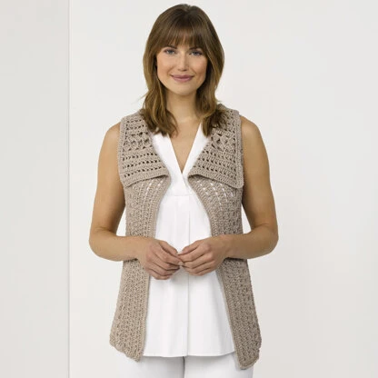Sesia Adelaide Crocheted Vest is a fantastic layering piece perfect for spring and summer outfits. This vest is crocheted from one center front edge, around the back, to the other center front edge for a totally seamless project. Windsurf Lux gives Adelaide Crocheted Vest a touch of shine and sparkle, and its great stitch definition is perfect for the lacy stitch pattern. Note: Stitch pattern is written only.