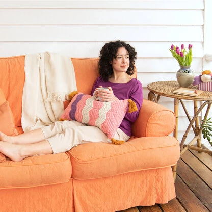 Part of The Fibre Co. By Hook Collection II, the Drifting Away Pillow has a colorful contemporary design that will brighten up your favorite chair or couch. This pillow is all about the squiggle, and that design feature both catches your eye and begins your project. Squiggles are crocheted flat with yarn held double, and the ends of each one are seamed together. The main body of the pillow is crocheted in the round from the squiggle edges out, with the third squiggle seamed in to join both halves. Surface crochet along each piece highlights the waving lines and gives a polished look to the pillow as well. A zipper is sewn into one end for a practical touch, making it easy to remove the pillow cover for washing. Luma yarn ensures that your finished pillow will be beautiful and soft with its versatile blend of Merino wool, organic cotton, linen, and silk. Choose your favorite shades and have fun making handmade décor to brighten your home with the Drifting Away Pillow! Crochet instructions are written out only.
