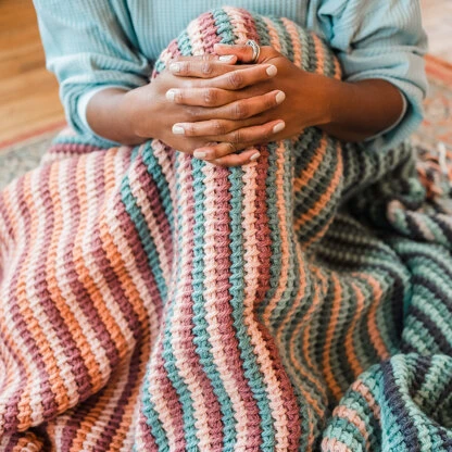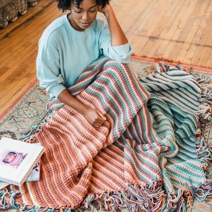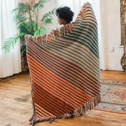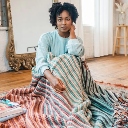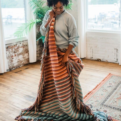 Bias stripes and bulky weight yarn pair up in the TL Yarn Crafts Amber Afghan to create the ultimate cozy blanket! Flex your Tunisian crochet skills with this project—helpful technique tutorial video links are included if you need a helping hand–and crochet a throw perfect for warming up your favorite crafting spot! Nine colors alternate in narrow stripes throughout this project, which is crocheted from corner to corner.