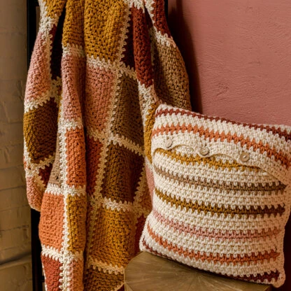 Add cozy warmth and custom color to your home with the Matilda Afghan and Pillow from TL Yarn Crafts! Your favorite crafting chair or reading spot on the couch can have an instant style upgrade with this crocheted pair! Both pieces are made from individual squares that are completed in the round before being sewn together during finishing. The blanket features linen stitch squares edged with triangles and framed with a border after seaming. The Matilda Pillow is a fantastic use for the yarn leftover from your afghan, and you can easily adjust your granny squares for the front and stripe patterns on the backs to make the most of the yarn you have left! Match your décor or a friend’s for a wonderful handmade gift! Video tutorial links are included in this pattern.