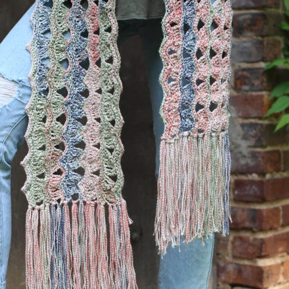 Names after the driest desert in the world, Universal Yarn Atacama Scarf features a rippling crochet motif and self-shading yarn that seem to mimic the amazing desert landscapes. This scarf is perfect for transitional weather and looks as incredible over tank tops as it would in cooler weather. This scarf is worked flat lengthwise and is finished with fringe. Crocheted in Fibra Natura Unity Beyond, a cotton, linen and bamboo blend with wool added to provide a lofty feel you don’t normally get in full cellulose fibers. This yarn is ideal for lightweight, warm weather garments and accessories; you’ll love Unity Beyond! The ripple pattern is charted and in written form.