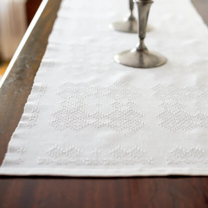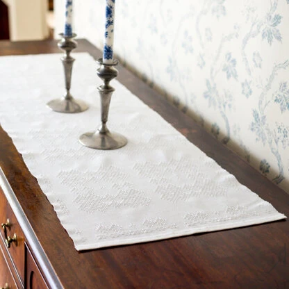 Weave Valley Yarns Lily Lace Runner designed by Barbara Elkins in delicate Huck Lace for special occasions or just to adorn a favorite bureau. The warp and weft floats pull the threads into graceful curves for an heirloom look. The easy-care cotton means it’s suitable for everyday use, too.