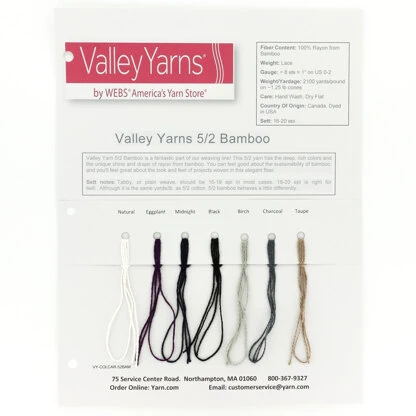 Valley Yarns 5/2 Bamboo is a fantastic part of our weaving line! This 5/2 yarn has a palette of deep, rich colors with the unique shine and drape of rayon from bamboo. You can feel good about the sustainability of bamboo, and enjoy the look and feel of projects woven in this elegant fiber. Although this yarn has the same yards per pound as 5/2 Cotton, 5/2 Bamboo behaves a little differently due to the nature of the fiber itself. Valley Yarns 5/2 Bamboo is spun and dyed in the United States.