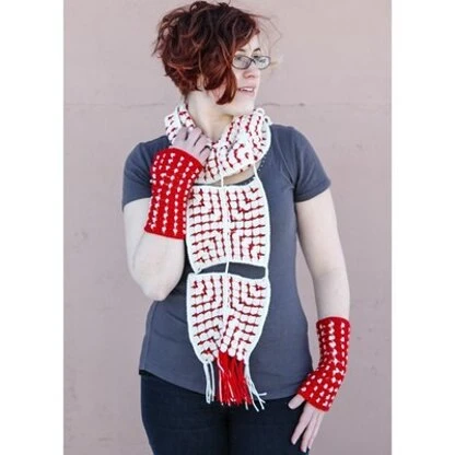 Inspired by the striking reds and whites of traditional Nordic folk art, the Nordic Tiles Scarf and Fingerless Mitt set is a great travel project as the tiles are completed individually then joined with simple surface crochet. A great mid-season set, these pieces are perfect to keep the chill off as Spring warms up. This set is worked in the soft and luxurious Valley Yarns Northfield, a cable-plied Merino, baby alpaca, and silk blend.
