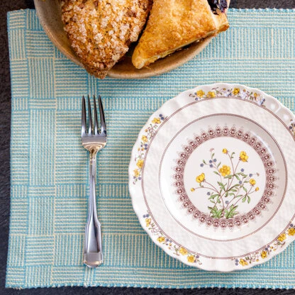 These mats use the same warping order, sett and number of ends as Draft #31, Stash Reduction Placemats, but the appearance and texture of the mats is quite different. Even using two colors in the weft, these mats weave up quickly because of the coarse sett and picks/inch.