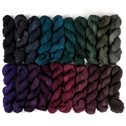 So Fond of Rainbows in Mad Hatter by Wonderland Yarns is a rainbow of color opportunities! With 20 colors in 1oz, 86 yard mini-skeins, the colorwork possibilities are seemingly endless! This yarn pack has a total yardage of 1720 yards of Sport weight yarn combine them all for a large project, like a temperature blanket or sweater, or spread them out over several smaller projects, like hats, scarves, and mittens.